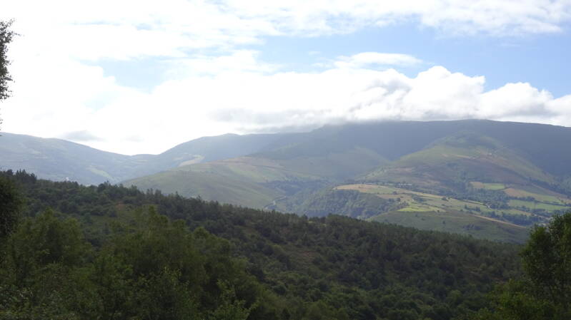Wir sind nahezu alleine auf der Straße und schrauben uns beständig höher und höher, kleine Zwischenabfahrten und kurze ebene Stücke geben ein wenig Abwechslung. Die Landschaft ähnelt ein wenig der Schwäbischen Alb. Die ersten Pilger begegnen uns recht spät, erst um 10 Uhr kommen uns die ersten entgegen. Die Anzahl ist stark eingebrochen immer nur vereinzelt und in kleinen Gruppen sind sie heute unterwegs.