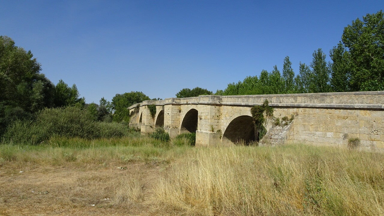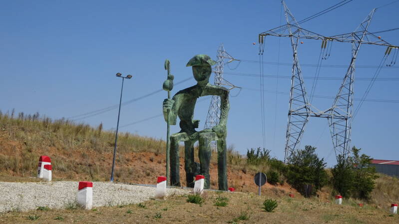 Nach Fromista ändert sich die Landschaft grundlegend, es wird hügeliger, rundum lauter Tafelberge und darauf Windrad an Windrad. Bäume fehlen nun fast gänzlich. Die Landschaft ist trocken und staubig. Es gibt zwar Kanäle, aber außer dem großen Canal Castilla sind die meisten trocken. Und jetzt sind sie da, die berüchtigten schnurgeraden Straßen, die man bis zum Horizont sieht und dem man sich nur sehr langsam nähert. Auch die Pilger müssen an diesen Straßen langlaufen. Zwischenzeitlich ist Mittagszeit und einige Pilger wirken sehr erschöpft. Auch wir spüren die immense Hitze des heutigen Tages. Zudem müssen wir Akku sparen, da die heutige Strecke rund 100 km lang ist und etwa 600 hm hat.