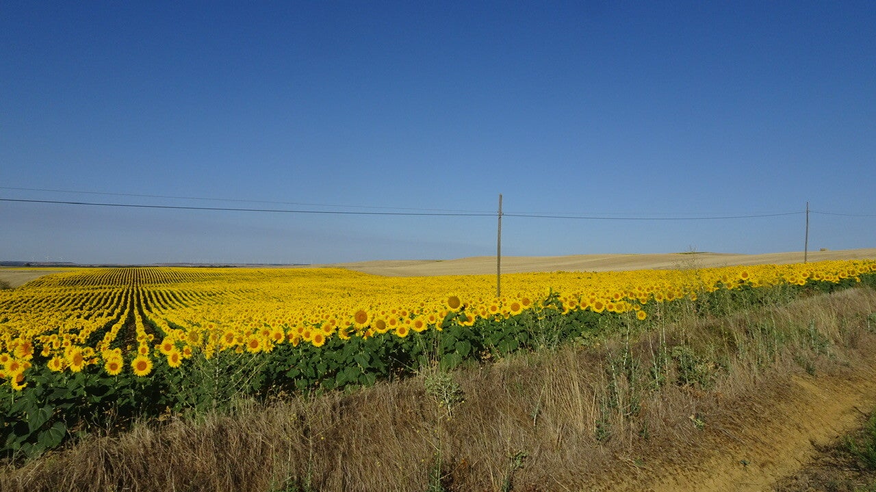 Die Strecke führte uns zunächst auf der wenig befahrenen Nationalstraße 980 nach Fromista. Bereits nach einer Dreiviertel Stunde hatten wir Fromista erreicht. Die Pilger, die uns entgegen kamen mussten neben der Straße auf dem Pilgerweg gehen. Die Strecke war ähnlich wie gestern, flach und der Blick war weit, überwiegend landwirtschaftliche Flächen, wobei das letzte Getreide gerade geerntet wird. Mais haben wir nicht mehr viel gesehen, überwiegend riesige Sonnenblumenfelder.