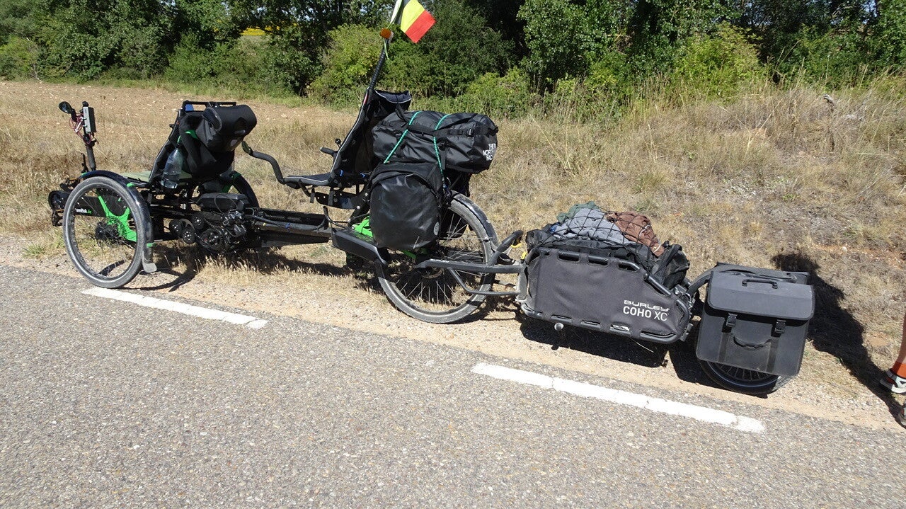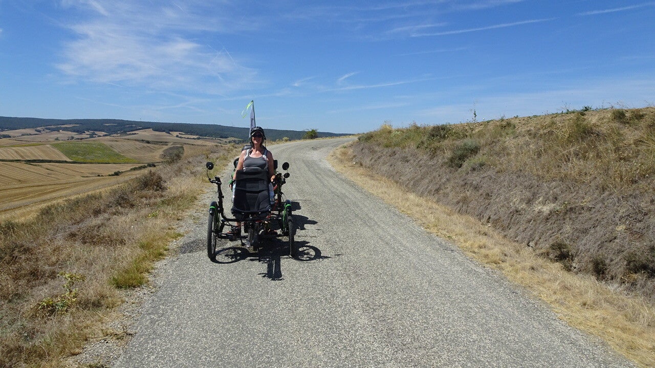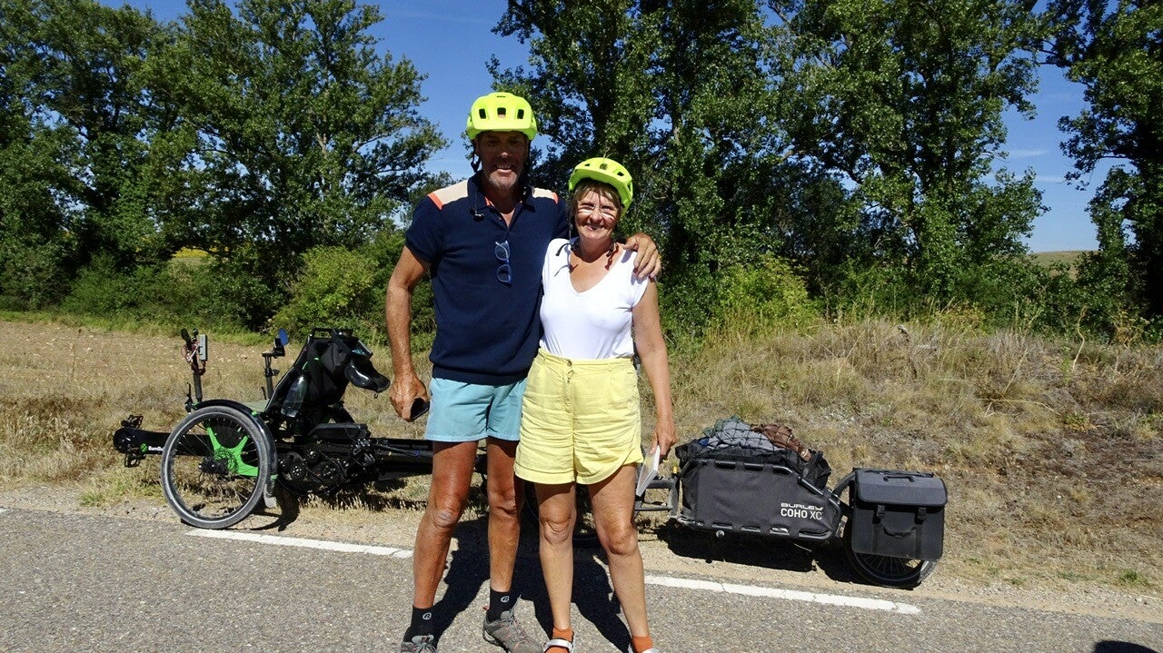 Zwischen Villascusa La Solana und Cerraton de Juarros folgt die Überraschung des Tages. Wir fahren bergab und kommen um eine Kurve und da kommt uns ein Bambuk-Tandem entgegen. Die Überraschung ist auf beiden Seiten und wir halten an und blockieren erst mal die ganze Straße. Mia und Dirk aus Belgien, die von Belgien aus den Eurovelo 3 (Pilgerweg) nach St. Jean Pied de Port gefahren sind und nun den Camino Frances nach Santiago. Die beiden wollen auf einem anderen Weg zurück fahren und ihre Reise in Andorra bei Bekannten beenden. Leider hatten Sie einige Probleme mit der Technik.