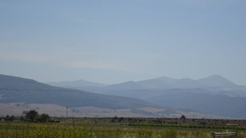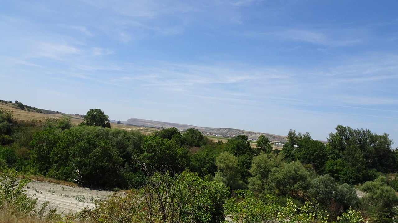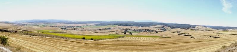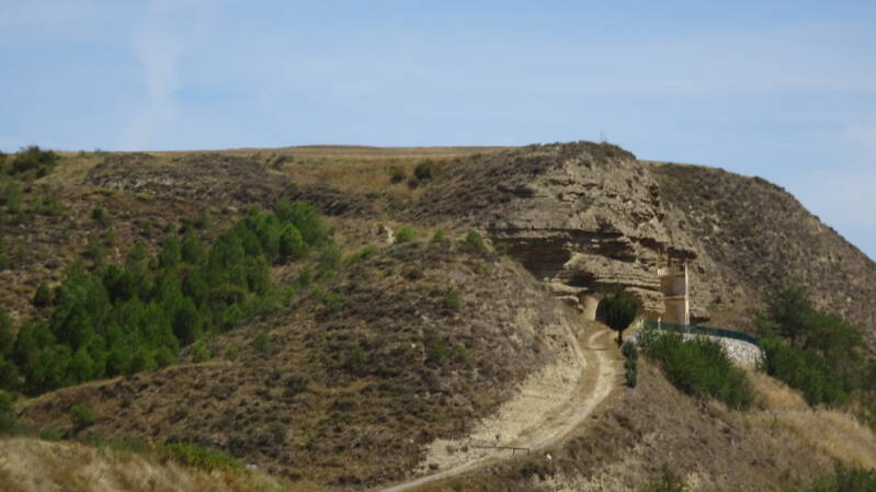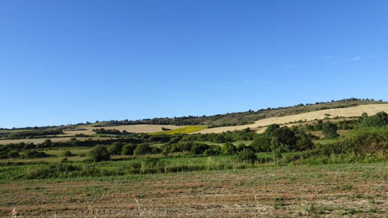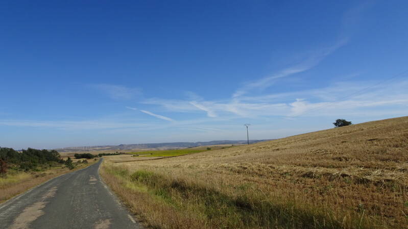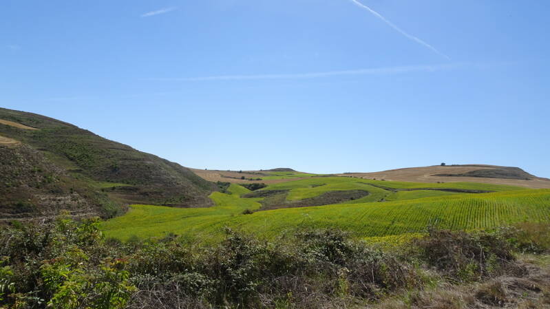 In Villalomez beginnt der letzte Anstieg, bevor es hinunter nach Belorado geht. Es ist heiß, kein Baum, kein Schatten aber wir müssen da hoch. Die Landschaft sehr imposant, jedes Zipfelchen wird landwirtschaftlich genutzt. Jetzt aber alles knochentrocken, bis auf die Sonnenblumenfelder.