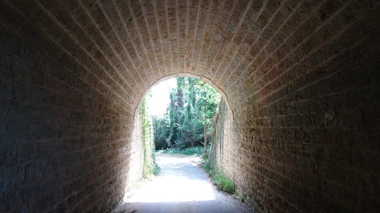 Irgendwie finden wir aus der Stadt hinaus und biegen auf eine Voie Verte, eine ehemalige Bahntrasse ein. Auf dieser sind auch die Pilger unterwegs. Die Voie Verte ist über weite Strecken zugewachsen, wie ein grüner Tunnel. Die Kühle des Schattens ist eine echte Gnade.