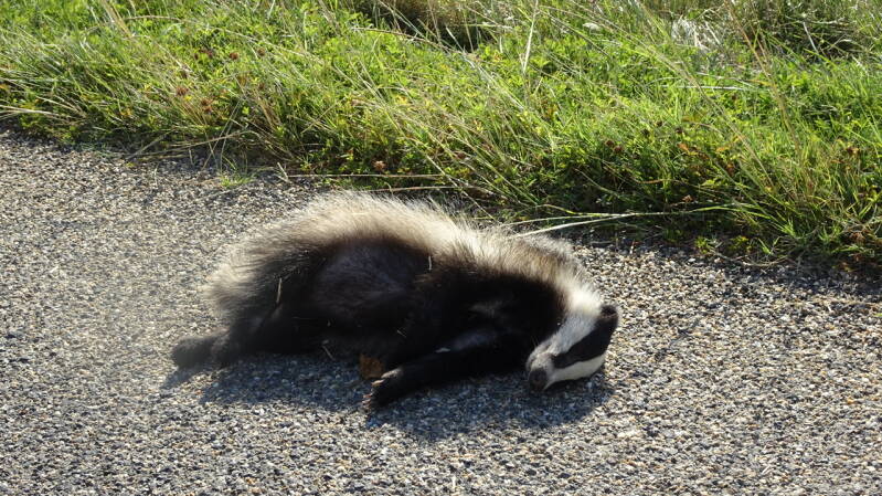 Tiere sehen wir ganz selten. Nutztiere ja, aber Wildtiere, mal ein paar Fasane, Rebhüner oder mal einen Hasen aber sonst… Heute haben wir einen Dachs gesehen, ein wunderschönes Tier, allerdings tot am Straßenrand, auf einer ganz wenig befahrenen Nebenstraße. Es ist so schade, wenn so ein wunderbares Tier dem Autoverkehr zum Opfer fällt.