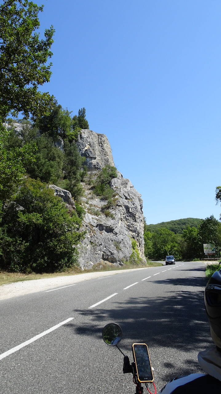 Danach geht es weiter auf der Landstraße, links fast senkrecht ansteigende Felsen und Hänge, rechts der Fluß und auf der anderen Seite ebenfalls steil ansteigende Hänge. Wunderbar und sehr gut fahrbar, wenig Verkehr aber, zwischenzeitlich ist es 14 Uhr, es ist heiß, der Asphalt strahlt zusätzliche Hitze ab, wir müssen schauen, dass wir ankommen.