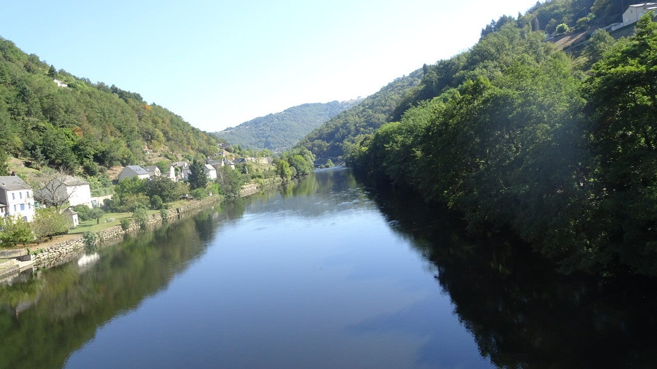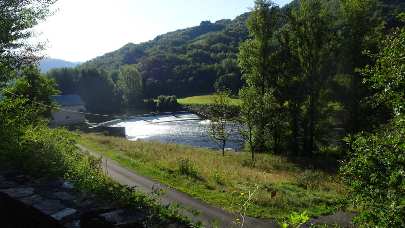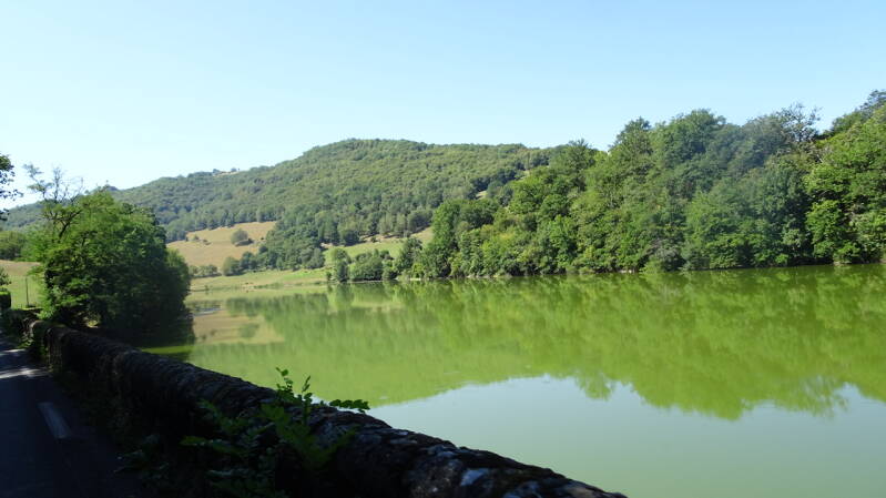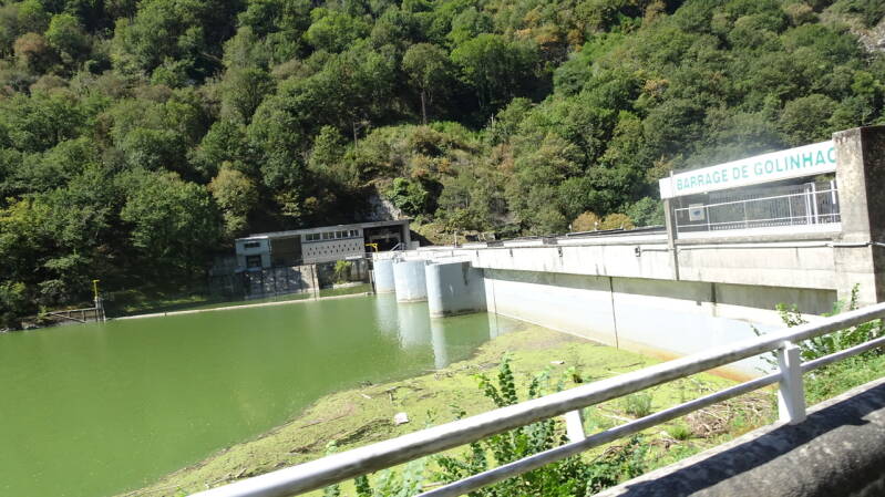 Die Landschaft ist grandios, so etwas sieht man sonst nur im Gebirge. Auf halber Strecke ist der Lot gestaut und es hat sich ein See, mit grasgrünem Wasser gebildet. An der Staustufe wird Strom aus Wasserkraft produziert. Einige Campingplätze haben sich angesiedelt, allerdings ist immer die Straße dazwischen und so weit wir sehen konnten, gibt es keinen Zugang zum Wasser.