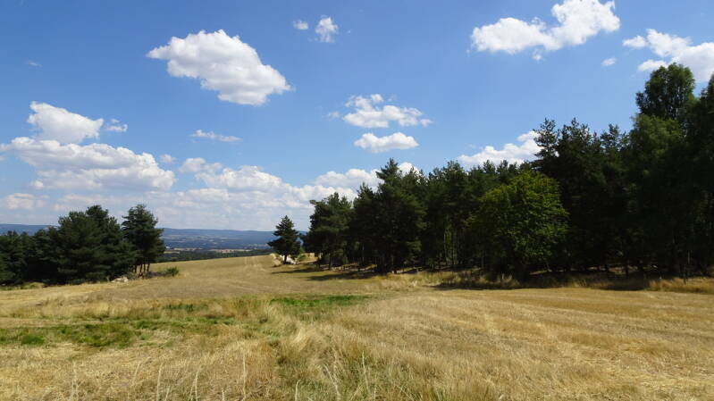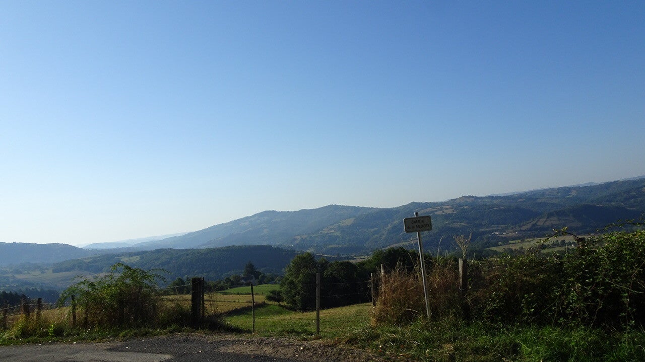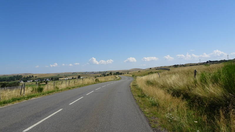 Die weitere Strecke verläuft auf einer Hochebene mit „kahlen“ Hügeln. Das Gras ist gelb und hoch, das Getreide weitgehend abgeerntet und überall grasen die Aubrac-Rinder, eine Fleischrind Rasse mit goldgelbem Fell, die man manchmal in dem hohen Gras kaum erkennen kann. Dann wieder ähnelt die Landschaft einer Prairie.