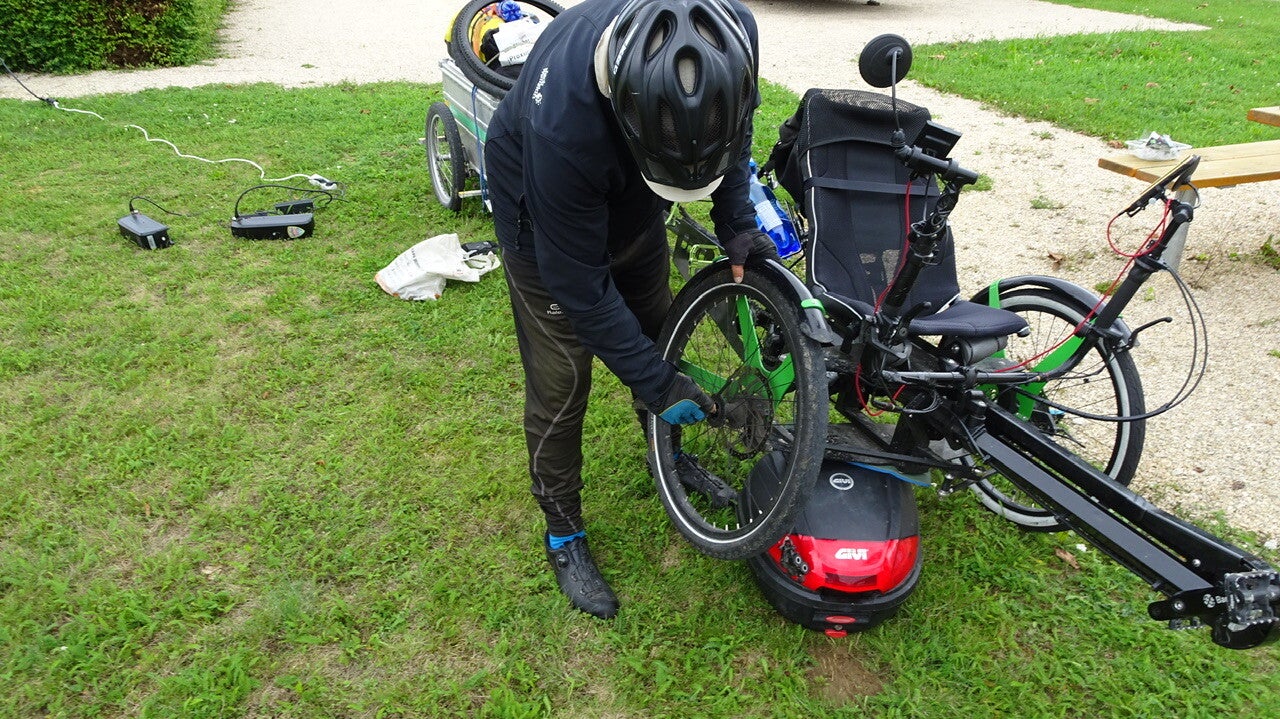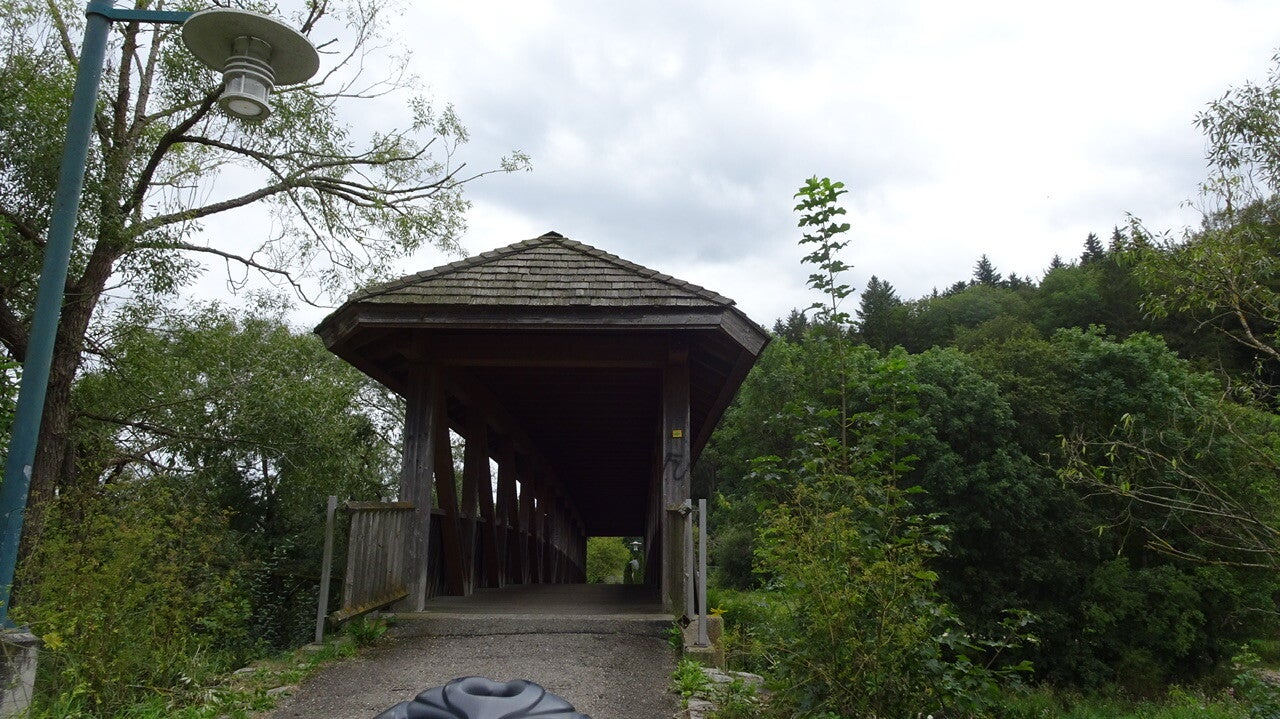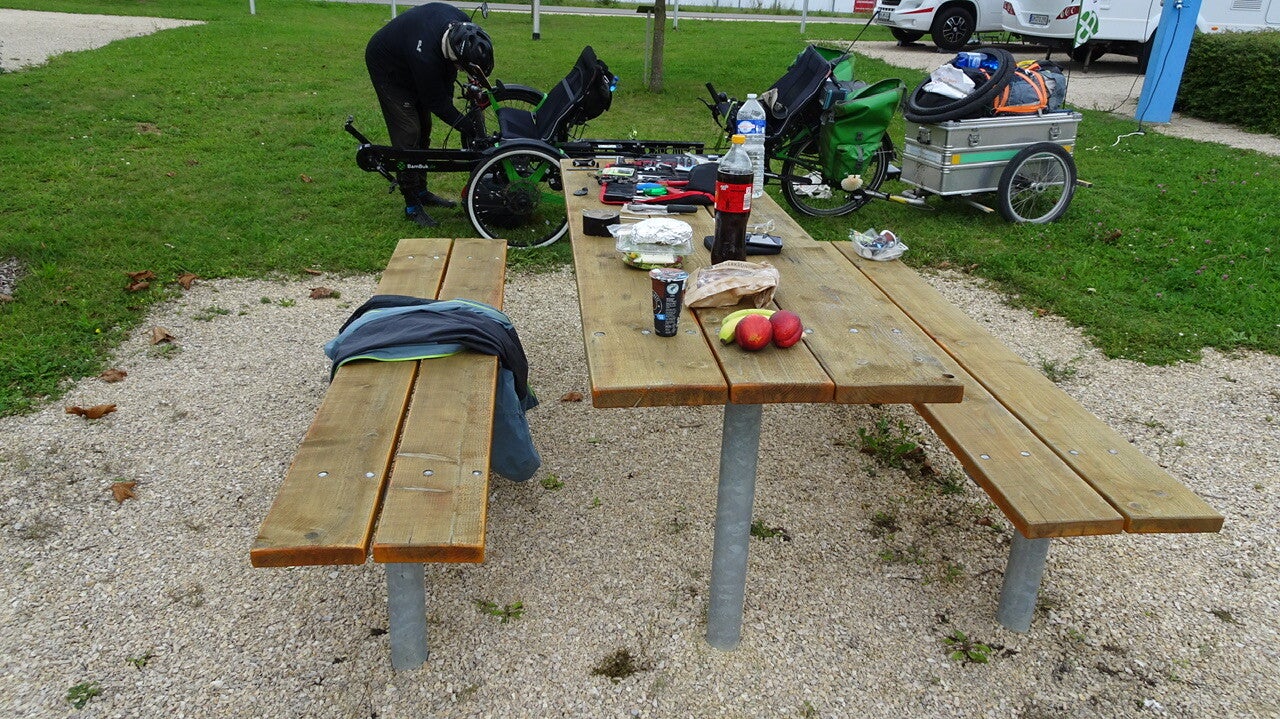 Eine E-Tankstelle fanden wir in Geisingen nicht. Dafür einen tollen Reisemobilstellplatz mit einer Menge Stromsäulen. Da konnten wir die Akkus laden und die gebrochenen Speichen wechseln. Dabei verbrauchte ich meine letzten drei Ersatzspeichen. Da die Räder eh komplett demontiert werden mussten, wechselte ich beidseitig auch die Bremsbeläge und vorne links den inzwischen völlig verschlissenen MTB-Reifen, gegen den Michelinreifen. Den MTB-Reifen haben wir jetzt als Reservereifen dabei. In einer Stunde und fünfundvierzig Minuten war alles erledigt. Evelin hatte in der Zeit Mittagessen besorgt und danach fuhren wir weiter. Es lief eigentlich super, ja, bis Immendingen. Wir fuhren am Ortsende von Immendingen auf eine überdachte Brücke und plötzlich blockierte etwas und schliff. Beim Nachsehen stellten wir fest, dass die Weber-Kupplung für den Anhänger, Fahrradseitig, gebrochen war. Und zwar war die Metallhalterung, die an die Achse geschraubt wird war durchgebrochen.