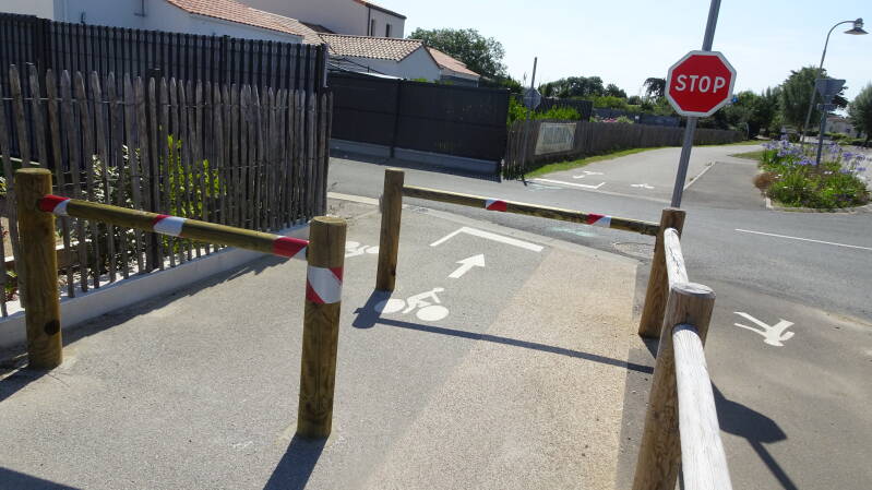 In einem Ort führte der Radweg uns zu der gemeinsten Barriere, der wir bis jetzt begegnet sind. Gut 100 m vorher beginnt ein schöner Holzzaun auf der rechten Seite, damit man auch ja nicht auf die Straße fahren kann und dann kommt die Barriere, so eng und durch zusätzliche Pfosten abgesichert, dass da kein durchkommen war. Da begegneten wir dann heute zum ersten Mal einem Moustache-Tandem mit einem jungen Paar, später stellte sich heraus, dass sie aus Steaßburg sind und in die gleiche Richtung wie wir fahren. Sie hatten uns kurz vor erreichen der Barriere überholt und kamen auch nur mit großen Mühen durch. Aber sie sind durchgekommen. - Wir nicht. Wir mussten den Anhänger abhängen aber auch mit dem Solo-Tandem ging’s vorwärts nicht. Also zurück und auf dem engen Weg wenden, wieder anhängen, zurückfahren, die maulende Komoot-Navigatorin ertragen, obwohl du eh schon auf 180 bist und dann auf der Straße weiter. Fazit, Werkzeug anders verpacken, damit man leichter dran kommt und beim nächsten mal wird der Sch… abgeschraubt.