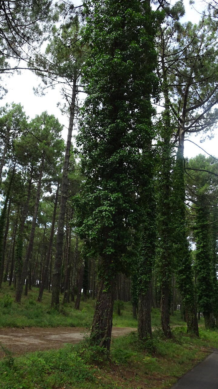 Für uns gingen die ersten 50 km fast permanent, auf überraschend guten Radwegen, durch Pinienwälder. Alte Wälder mit riesigen Pinien. Die Zikaden waren offensichtlich noch nicht wach, denn von ihnen war noch nichts zu hören. Außer uns waren nur ein paar Frühsportler unterwegs, oft begegneten wir viele Kilometer lang keinem Menschen. Wir sind ja jetzt schon einige Tage durch diese Wälder gefahren. Außer Zikaden, Vögeln und ein paar Eidechsen waren keine anderen Tiere zu sehen, kein Reh, kein Fuchs, keine Wildsau, kein Bär, kein… 😆 Schon ungewöhnlich, normalerweise sieht man immer irgendetwas, und wenn es nur eine Maus ist. Außergewöhnlich war, dass einige der riesigen Zedern am Stamm mit Efeu überwuchert waren. Das schnauf, wie ein Tannenbaum in der Zeder. Sieht schön aus, wird für die Zeder aber nicht angenehm sein.