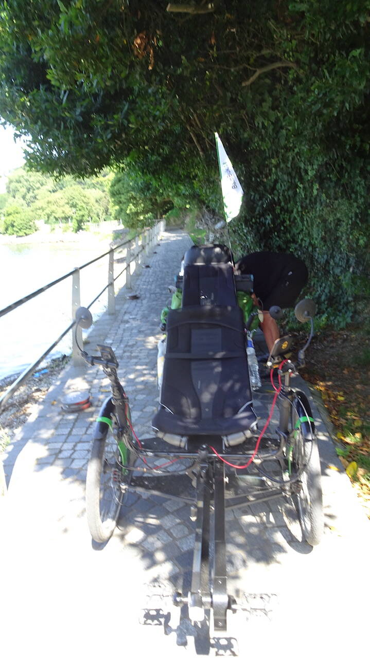 Über eine vielbefahrene Landstraße wurden wir in einen Mordsstau geleitet, konnten aber über das Straßenkandel bzw. den Gehweg ganz nach vorne fahren, mussten aber zum Linksabbiegen wieder über einen 20 cm hohen Absatz auf die Straße zurück, dabei musste die Mitfahrerin absteigen und ein wenig Schiebehilfe geben.