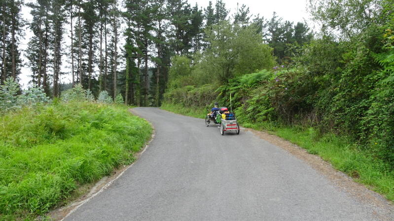 Unten angekommen bogen wir in ein hübsches Bergdorf ab, wo wir eine Vesperpause einlegten um danach den zweiten Berg mit erneut 500 hm anzugehen. Diesmal allerdings auf einer normalen Straße mit Steigungen im Maximum von 12%, überwiegend aber 5-8%. Eigentlich relativ easy zu fahren, braucht aber trotzdem Strom. Nach rund 300 hm war auch der zweite Akku leer und wir hatten noch 200 hm bei diesem und weitere 200 hm beim folgenden Berg und gut 34 km bis Bilbao.