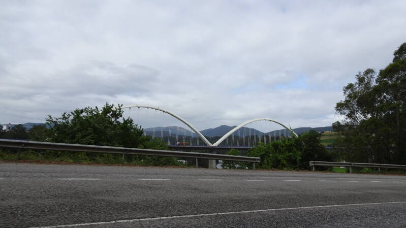 Wir sind dann im Vollpiss weitergefahren und mussten den Ria de Ribadero o del Eo und damit die Grenze nach Galizien überqueren. Dies geht über die Autobahnbrücke. Da gibt es links und rechts einen abgeteilten Streifen für Fußgänger und Radfahrer. 700 m lang geht’s da rüber und am Anfang ging’s eigentlich ganz gut, es war schmal aber mit eingeklappten Spiegeln waren links und rechts noch jeweils so 5 cm Platz. Aber wie immer, kommt das dicke Ende ja am Schluß. Drauf lassen Sie dich und dann, setzen Sie irgendeinen Pfosten oder Zaunpfahl so, dass die Lücke 10 cm schmäler wird. Voraus eine Pilgerin, hinter uns 3 Radpilger (zum Glück), dann kam der Lichtmast, der unten zur Stabilisierung mehrere metallene Verstärkungsstreben angeschweißt hatte. Ja und dann war erst mal Licht aus im Schacht. Vorwärts ging’s nicht, umdrehen und zurück absolut keine Chance. Damit steckte der Korken in der Flasche und nix ging mehr. Wir sind weder an unsere Satteltaschen noch an den Anhänger dran gekommen.