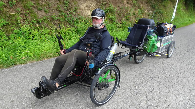 Eigentlich wollten wir nicht, aber der weitere Streckenverlauf war auf dem Handy völlig unklar und der Camino biegt bei jeder Gelegenheit auf Waldpfade ab. Also haben wir uns entschieden, der Streckenführung unserer Navigatorin zu folgen. Bis zur ersten Kehre ging’s noch, alleine auf dem Bock und danach noch 50 m weiter und dann kam Splitt und es war Sense. Nur mit drei Bremsen war das Gespann an der Steigung zu halten. Wir machten Fahrerwechsel und einer schob, das brachte uns 10 m weiter und dann kam von oben ein Traktor, der nicht an uns vorbei kam und wir kamen nicht weiter rauf.