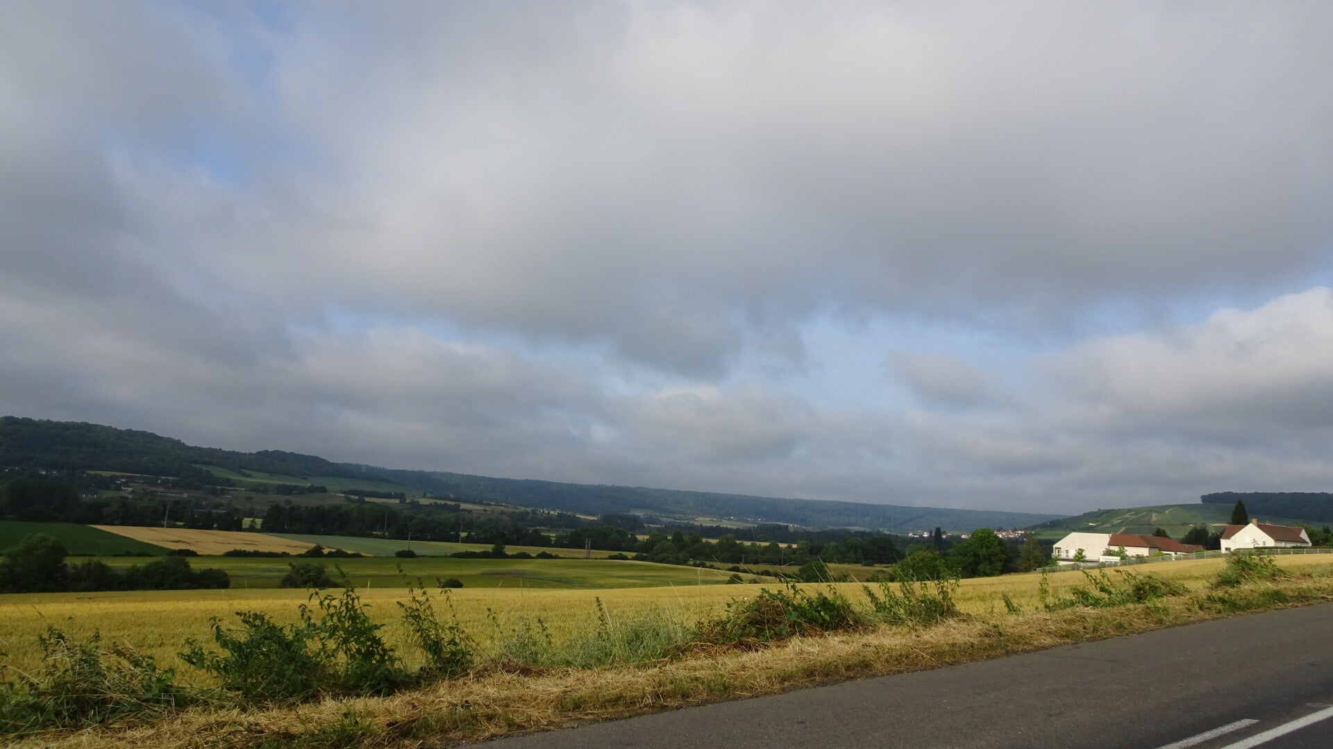 Unsere Komoot-Route führte uns weg von der Marne aber dann parallel etwa 50 hm oberhalb an der Marne entlang. Dadurch fuhren wir durch viele Ortschaften der Champagne und es ging ständig auf und ab. Überall Werbung der „Weingüter“ aber sonst… Die Straßen, die wir befuhren waren schlecht, bis außergewöhnlich schlecht. Schlaglöcher, Flickstellen, Offene Deckenbrüche, Längsrinnen (ich verwende mit Absicht nicht das Wort Rillen, das würde den Zustand verniedlichen). Das hatte aber den Vorteil, dass auch der übrige Verkehr recht gesittet unterwegs war. Radwege gab es scheinbar keine, zumindest keinen Fernradweg direkt an der Marne.