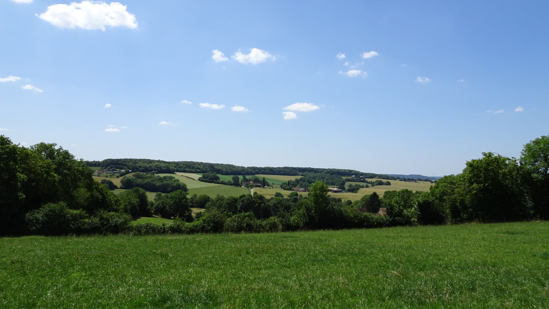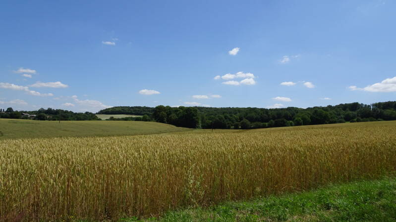 Die heutige Route war mindestens so schön wie die gestrige, allerdings hatte sie einen gänzlich anderen Charakter. Während gestern noch die verstreuten kleinen Ortschaften mit ihren wunderschön renovierten alten Häusern dominierten, war es heute die Landschaft. Zuerst fuhren wir längere Zeit an einem Fluß und immer wieder an kleiner Seen vorbei. Danach fuhren wir über eine Hochfläche, ähnlich der Schwäbischen Alb, nur irgendwie größer und weiter. Wir fuhren an riesigen Feldern, Getreide, Raps, Erbsen, Kartoffeln und Rüben entlang und alles auf kleinen Landstraßen, nahezu ohne Verkehr. Es war total klasse und völlig entspannend. Später wechselte die Landschaft und glich nun eher dem Schwarzwald oder dem Allgäu, tief eingeschnittene Täler, überall Felder und kleine Wäldchen, auf den Höhen verstreute Gehöfte und kleine Weiler, sagenhaft schön, aber auch anstrengend, da es ständig auf und ab ging.